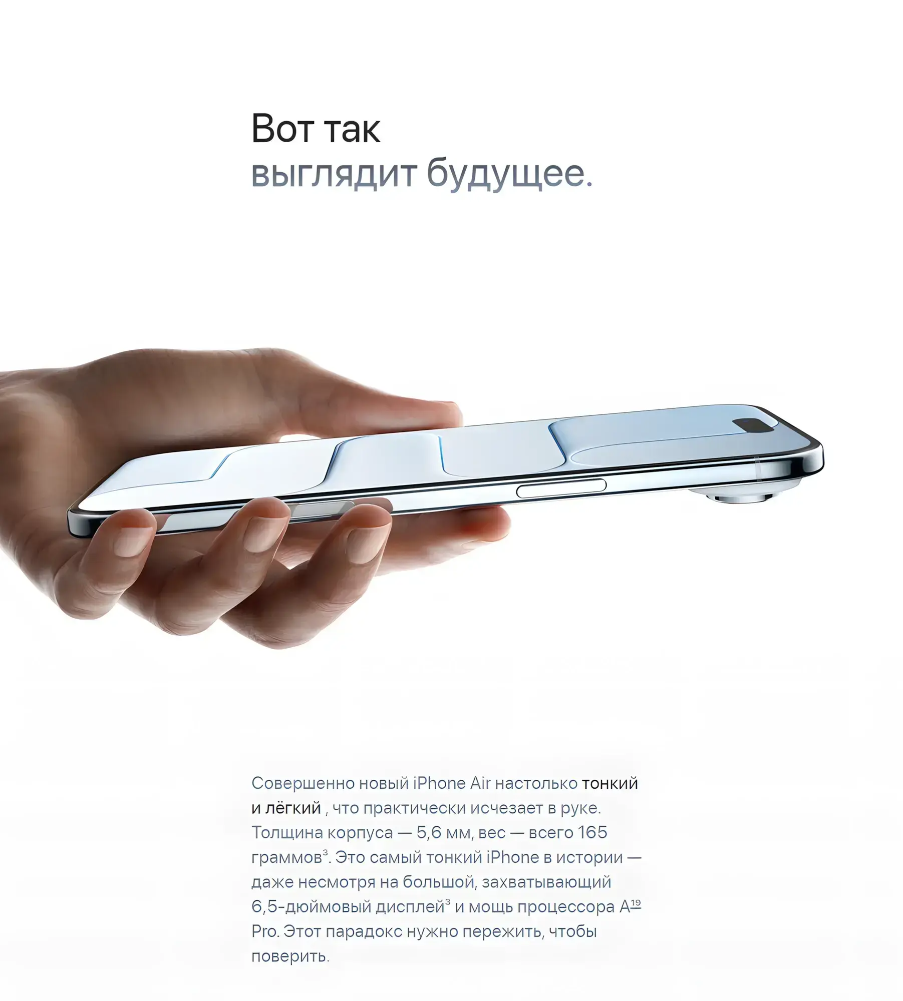 iPhone Air — новый класс смартфонов в портфолио Apple, ориентированный на пользователей, ценящих ультратонкий дизайн без компромиссов в отношении функциональности.